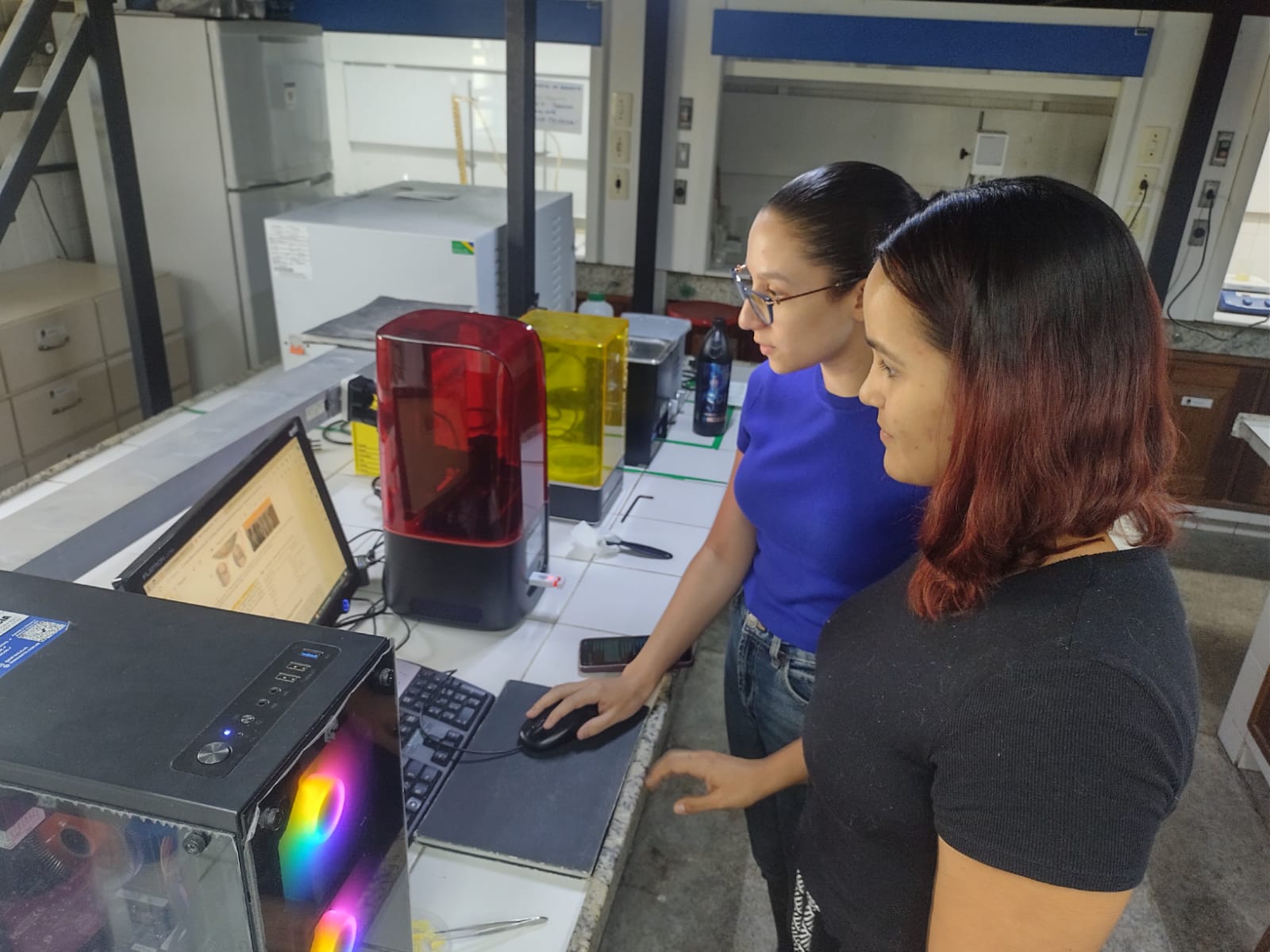 Pesquisa e prototipação. Lis Vieira (frente) e Luísa Tertuliano (fundo)